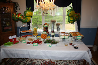 Since we didn't get in until 10ish on Thursday night I was not able to bake or start any party prep until Friday. I did do some prep work in Florida. For a craft I wanted to kids to make butterflies so I made all the butterfly bodies and glued them to the canvases and brought them with me. I also made caterpillars that said "happy birthday tyler," a caterpillar photo gallery, caterpillar and polka dot cookies for favors, caterpillar stickers, and table tent food cards.